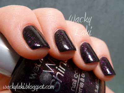 The polish itself is a black base packed with purple glitter. The glitter sparkles beautifully through the base and is not at all overpowered by the black. Application was great, I applied two coats plus a top coat. It probably could have benefited from a thicker topcoat or at least a second layer. I have been wearing it all weekend and loving it :)