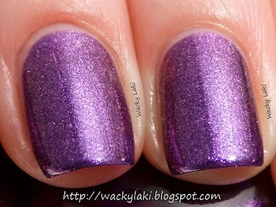 A purple base with violet shimmer flecks. It builds up to full coverage in two thick coats or three think ones, as I used here. This beauty just radiates from within. I couldn't stop staring at it. In the bottle it seems to have a golden duochrome shift which can be seen around the corners, but does not translate to the nail. Without a doubt this is my favorite. Swatches are with no top coat...