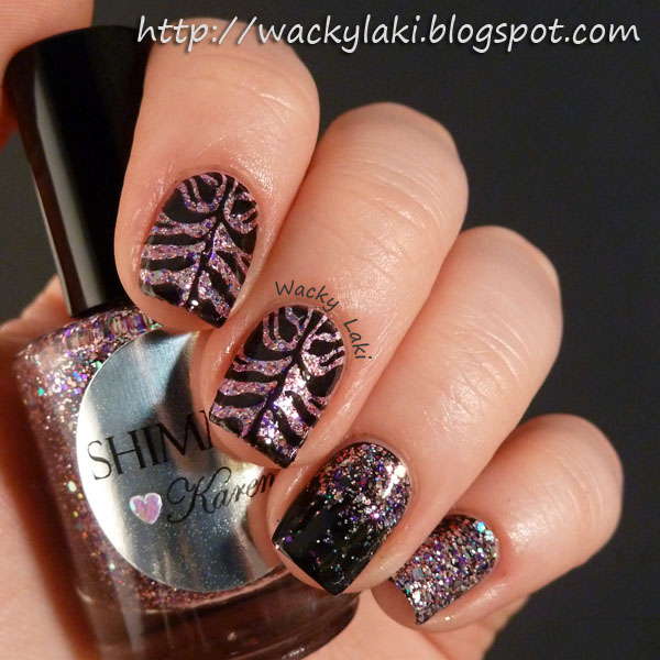 Index and middle fingers: Two coats of Shimmer Karen over China Glaze Astro-Hot base, stamped with Cheeky CH2 and Essence Stampy Black.