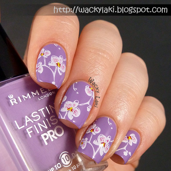 To create this manicure, I started out with a base of Rimmel London Wild Orchid. I picked it for the color, but the perfect fitting name didn't hurt either. I stamped the orchids from MoYou London Pro XL plate 14 using KleanColor White.