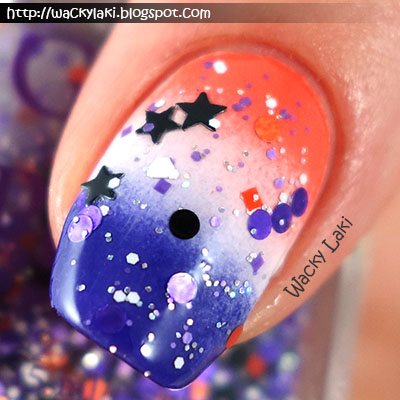 A clear base loaded with a mixture of purple, orange, black and white glitter in various sizes including circles, squares and stars. The glitter does tend to settle in the base so I suggest either storing this one upside down or at least placing it upside down for ~10 minutes prior to use. For these swatches, I brushed/dabbed about 2 coats of glitter over OPI My Signature is "DC". I love the circle glitter in this mix. It is small and comes out easily with each brush stroke. I didn't have to do any fishing around to get a great mix in both of these manicures. Swatches are with a top coat...